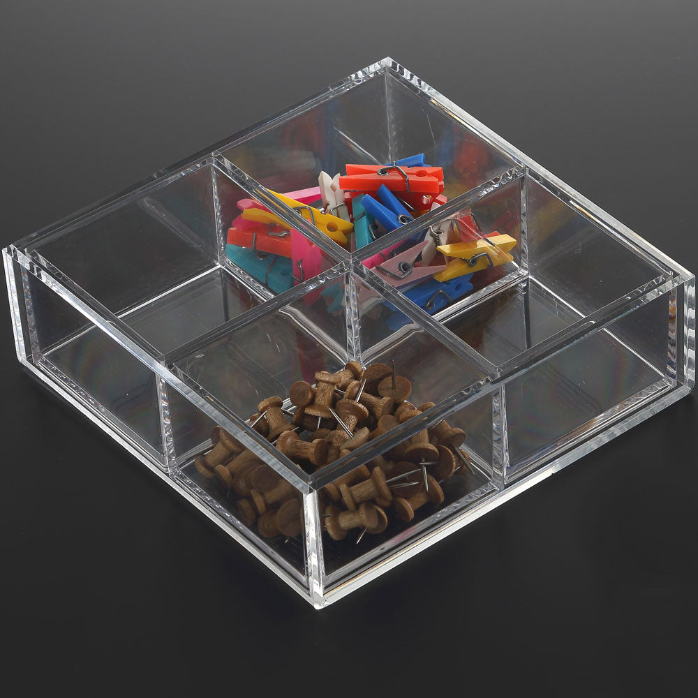 This desk drawer tray is constructed from heavy-duty acrylic for long-lasting quality. and the clear. see-through design allows you to easily see the items that are stored inside. The small square tray is designed to fit inside each organizer tray. allowing you to create sections so you can keep smaller accessories neatly organized so they are easier to find. The bin is perfect for storing arts and craft accessories. office supplies. cosmetics. and so much more.