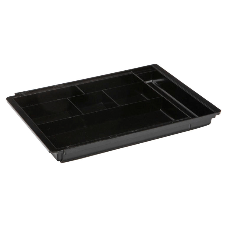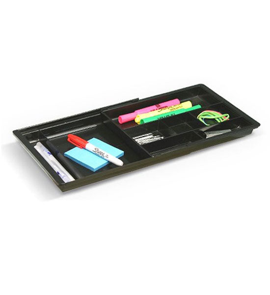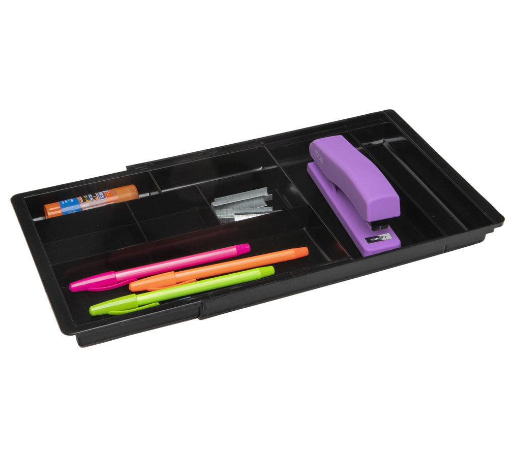 The Black Drawer Doubler Divided Organizer is the perfect way to organize the space at the top of a drawer. The desk drawer organizer rests on each side of the drawer to provide a spot to place small items that would otherwise get lost on the depths of the drawer. Constructed from durable plastic to last for years and finished with a smooth black color so stains will not show easily. this drawer divider is ideal for home or the office. The plastic drawer divider adjusts to fit most drawers.