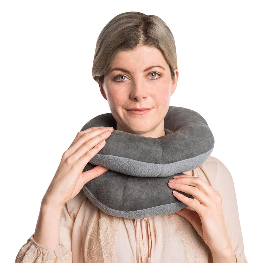 The travel neck support pillow has a u-shaped design and interlocking ends. which keep the pillow in place and your head from falling forward. This neck pillow for travel features soft and comfortable fabric and works great for reclining. full or side support.