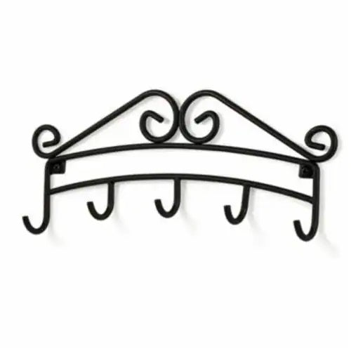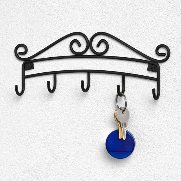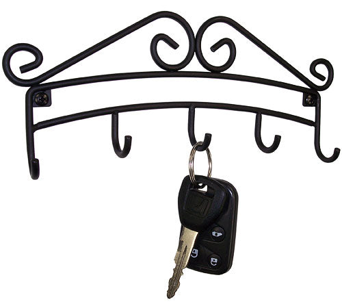 Now the entire family can hang their key rings in one convenient location with the stylish Scroll Five Hook Key Rack. This wall mounted key organizer will help end the frustration of lost or misplaced keys. and adds a subtle decorative touch to any entryway. mudroom. hallway. or kitchen decor. This key rack is constructed from durable steel and features a stylish black finish.
