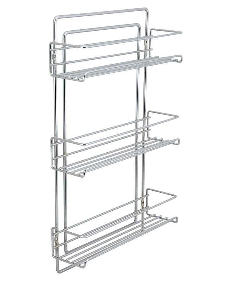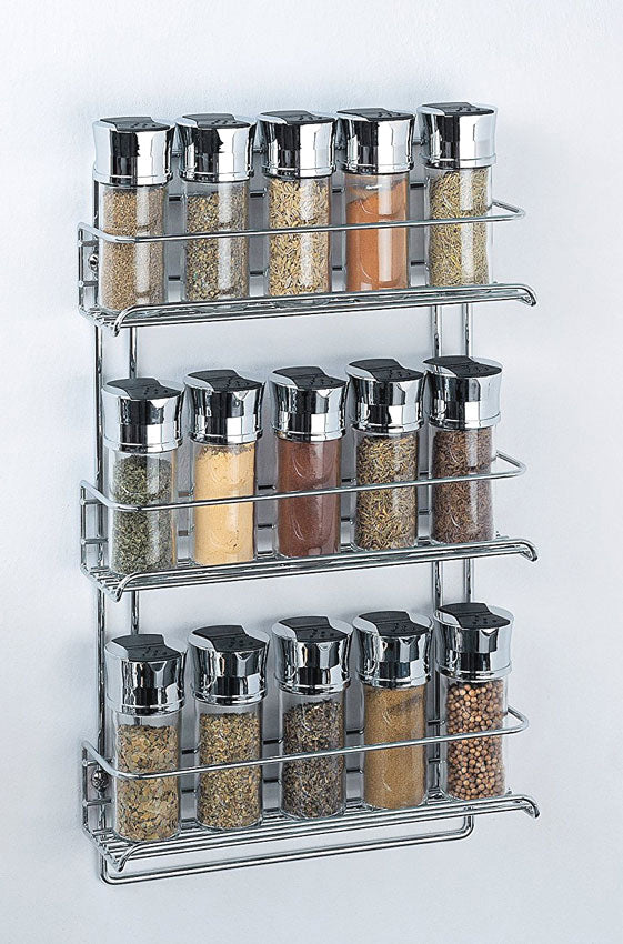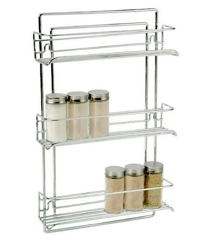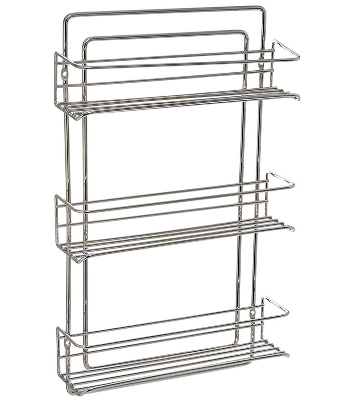 Save shelf and cabinet space with a wall mounted chrome organizer. This Three Tier Spice Rack mounts to a wall. inside a cabinet. on a cupboard door. or in the pantry and lets you organize all of your spices. Now you'll never have to go digging for the Oregano again! This attractive spice rack features steel wire construction with an elegant chrome finish.