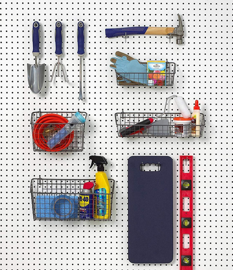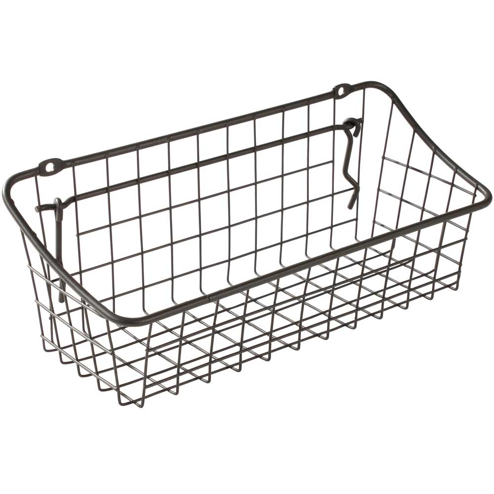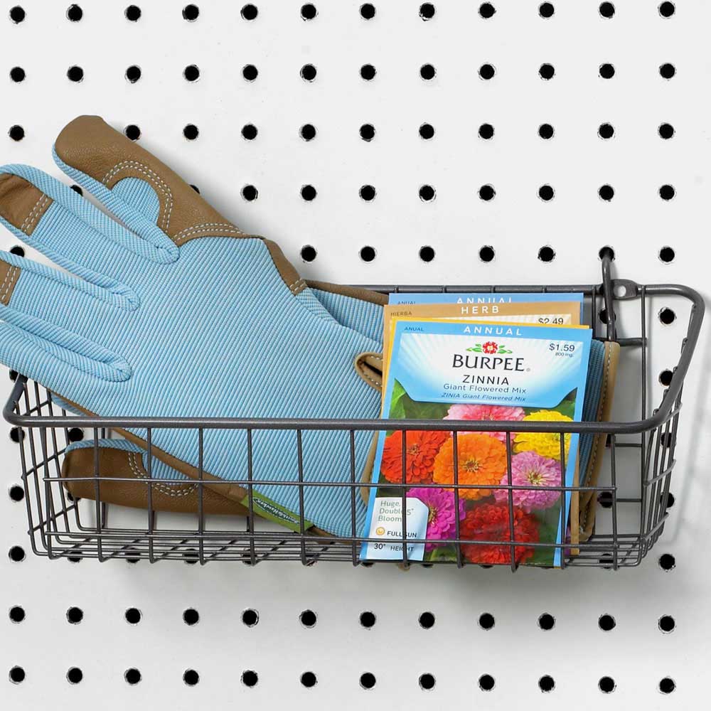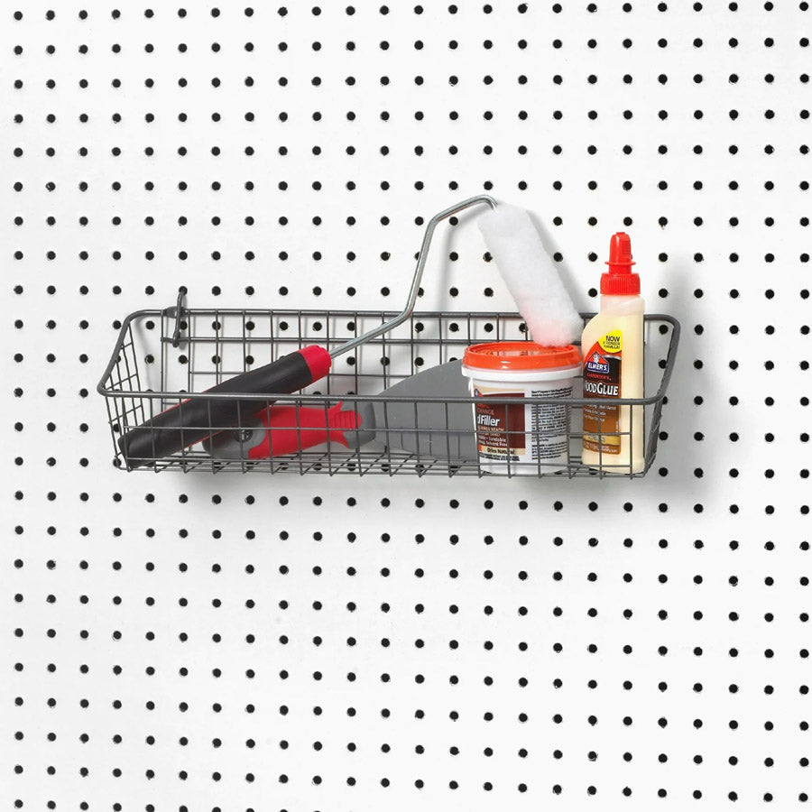 Add usable storage space to your household. workshop. or even your garage with this Wall Mount Storage Basket. The innovative design of this wire basket allows you to mount it to the wall for compact storage. or you can hang it on your pegboard to effectively store smaller accessories. The included matching hardware and pre-drilled holes makes it easy to install the wire basket to drywall or wood surfaces. and two hanging hooks allow you to attach the basket to most pegboards.